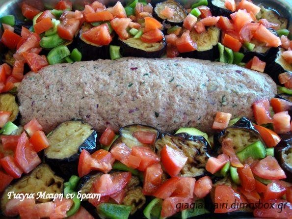 βάζουμε στο ταψί την μισή δόση κιμά και το κάνουμε μια λουρίδα στο κέντρο του ταψιού, πατάμε στο κέντρο να γίνει μια αυλάκι και ρίχνουμε τις πιπεριές κέρατο και από πάνω την φέτα. με τον υπόλοιπο κιμά σκεπάζουμε το ρολό μας!! δεξιά και αριστερά στο ταψί βάζουμε με την σειρά τις πατάτες, τα κολοκυθάκια, τις μελτζάνες, και από πάνω ρίχνουμε τα κυβάκια απο τις πιπεριές την ντομάτα, σε ένα λεκανάκι βάζουμε τον χυμό ντομάτας το κρεμμύδι, το σκορδάκι, και τον μαϊντανό και τα περιχύνουμε πάνω από τα στρωμένα υλικά μας!!!! << σε κάθε στρώση υλικών ρίχνετε μπόλικο αλατοπίπερο>> τέλος ρίχνουμε το λαδάκι και τα ψήνουμε περίπου μιάμιση ωρίτσα!!!! αν θέλετε βάζετε πάνω απ το ρολάκι σας ντομάτες ροδέλες καλή επιτυχία
