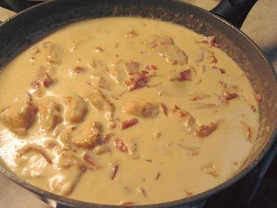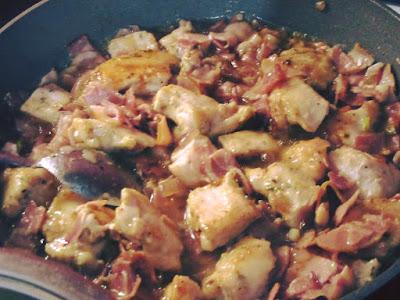 2 Φιλέτα κοτόπουλου σε μπουκιές 1 μεγάλο κρεμμύδι 10 φέτες Μπέικον 1 κρέμα Γάλακτος 500ml 1 ποτ του κρασιού κρασί ότι έχετε λίγο αλεύρι για το αλεύρωμα Αλάτι πιπέρι μαϊντανός.