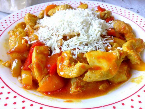 Σοτάρουμε το κοτόπουλο με λάδι και κρεμμύδι..στη συνέχεια σβήνουμε με κρασί… μόλις εξατμιστεί προσθέτουμε τα μπαχαρικά κατόπιν τίς πιπεριές κομμένες σε λωρίδες… βράζουμε για πέντε λεπτά και ρίχνουμε τη ντομάτα… βράζουμε μέχρι να ψηθεί το κοτόπουλο και να μελωσει η σαλτσούλα.. Βράζουμε τα μακαρόνια σε αλατισμένο νερό… και σερβίρουμε με τυράκι…