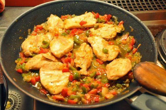 Σε ένα τηγάνι βάζουμε λίγο ελαιόλαδο και τσιγαρίζουμε το κρεμμύδι μαζί με τις πιπεριές καί λίγο αλάτι σε χαμηλή φωτιά μέχρι να μαλακώσουν οι πιπεριές. Αφαιρούμε το κρεμμύδι και τις πιπεριές από το τηγάνι και προθέτουμε λιγό ακόμα λάδι αν χρειάζεται και τηγανίζουμε τα φιλετάκια κοτόπουλου. Όταν όλα τα φιλετάκια τηγανιστούν, τα προσθέτουμε όλα στο τηγάνι, μαζί με το κρεμμύδι και τις πιπεριές και σβήνουμε με την μαρινάδα μας. Μόλις πάρει μια βράση η σαλτούλα, χαμηλώνουμε την φωτιά και σιγοβράζουμε για 10 λεπτά ακόμα μέχρι να πήξει. Αν παραμένει αρκετά αραιή, μπορούμε να την δέσουμε με λίγο corn flour.