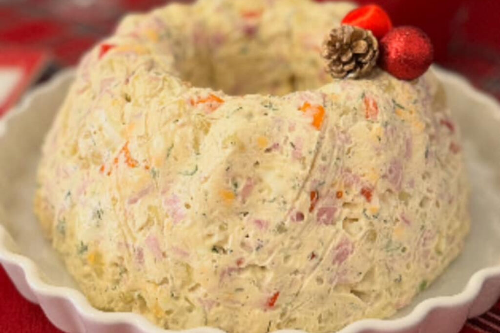 Ψιλοκόβουμε το φρέσκο κρρεμμυδάκι, τη κόκκινη πιπεριά, τον άνηθο, το ζαμπόν και τα αυγά. Ανακατεύουμε τα υλικά μας στο μείγμα με το γιαούρτι και στο τέλος βάζουμε τις πατάτες και ανακατεύουμε και πάλι. Φορμάρουμε σε φόρμα του κέικ στρωμένη με διάφανη μεμβράνη και την αφήνουμε στο ψυγείο όλο το βράδυ. Ξεφορμάρουμε σε πιατέλα. Σας άρεσε αυτή η συνταγή; Πείτε μας την γνώμη σας στα σχόλια.