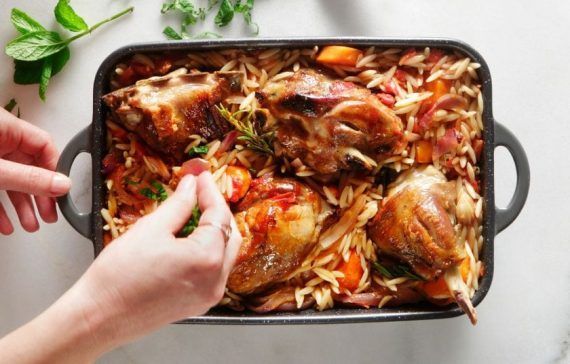 Παράλληλα, σε μια μικρή κατσαρόλα ζεσταίνουμε το βούτυρο σε μέτρια φωτιά και σοτάρουμε το κριθαράκι για 5-6 λεπτά ή μέχρι να χρυσίσει. Προθερμαίνουμε τον φούρνο στους 180° C. Μεταφέρουμε το αρνάκι με τα λαχανικά και τα υγρά του σε γάστρα. Προσθέτουμε το κριθαράκι και αλατοπίπερο και ανακατεύουμε. Σκεπάζουμε τη γάστρα και ψήνουμε για 30 λεπτά. Αφαιρούμε το καπάκι, προσθέτουμε 200 ml ζεστό νερό και ψήνουμε για 15 λεπτά ακόμα ή μέχρι να γίνει το κριθαράκι. Αφαιρούμε από τον φούρνο, σκορπίζουμε τον δυόσμο και συνοδεύουμε με λαχανικά στον ατμό.