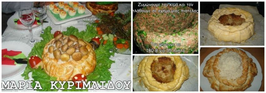 ΠΡΟΕΤΟΙΜΑΣΙΑ ΓΙΑ ΤΟ ΠΙΛΑΦΙ Σε κατσαρόλα με 400 μλ. νερό (και μα αλατάκι)βράζουμε το ρύζι καλά πλυμένο.Αν θέλουμε προσθέτουμε και ένα κύβο κνορ ζωμού λαχανικών. Αφήνουμε το ρύζι μέχρι να πιει όλο το νερό του και το αποσύρουμε . ΠΡΟΕΤΟΙΜΑΣΙΑ ΜΑΝΙΤΑΡΙΩΝ Στο τηγάνι σοτάρουμε με λίγο λαδάκι ,αλατάκι,πιπέρι,δεντρολίβανο τα μανιτάρια μας μέχρι να ροδοκοκκινισουν από όλες τις πλευρές ΠΡΟΕΤΟΙΜΑΣΙΑ ΣΦΟΛΙΑΤΑΣ Τα έτοιμα φύλλα σφολιάτας,τα κόβουμε σε λωρίδες πάχους 2 περίπου εκ. και με αυτά πλέκουμε την ψημένη βάση με το κιμά έτσι ώστε να καλύψουν όλη σχεδόν την επιφάνεια τοθ(αφήνουμε το κέντρο του για να γεμίσουμε το ρύζι)Πλέκουμε τέλος και λωρίδες που θα τα χρησιμοποιησουμε για χερούλια.