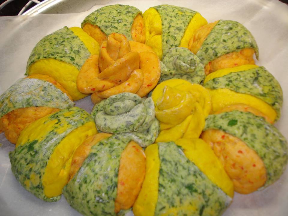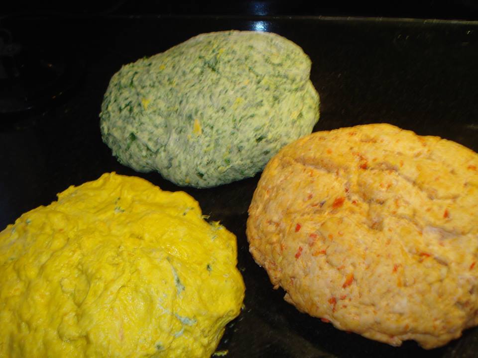 6 φακελάκια ξηρή μαγιά 1 κγ ζάχαρη , 3 κ.σ αλατι, 15 με 18 κσ λαδι(το κάθε ψωμί 5 με 6) 3 κιλά αλεύρι γοχ και νερό οσο σηκωσει ! Σπανακι, κολοκυθι τριμμενο, σκονη μουσταρδα η κουρκουμα , κοκκινες πιπεριες ψημενες και κοκκινο πιπερι γλυκο!