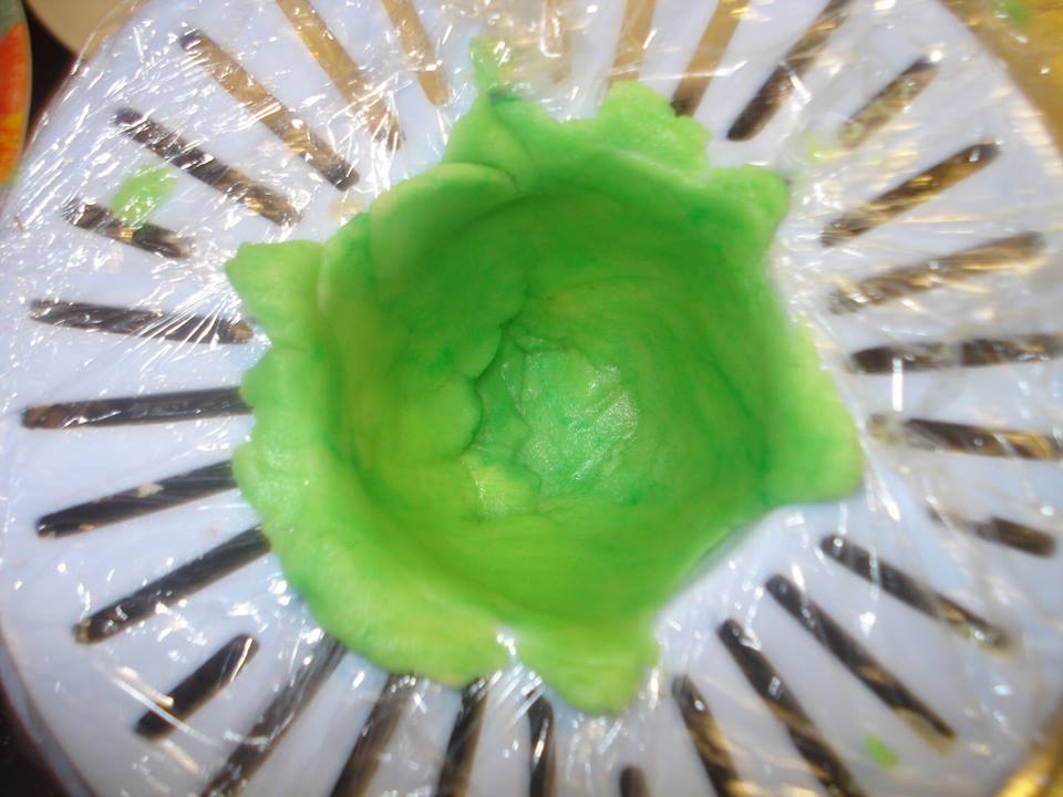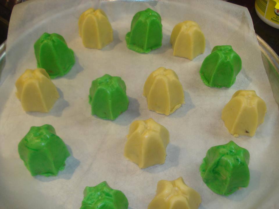ΕΚΤΕΛΕΣΗ: Χτυπαμε με το μιξερ το βουτυρο που ειναι σε θερμοκρασια δωματιου ! Προσθετουμε την αχνη ζαχαρη και συνεχιζουμε το χτυπημα προσθετοντας και τις βανιλιες! Προσθετουμε σιγα σιγα το αλευρι μεχρι να γινει μια ζυμη που να μην κολλαει στα χερια! Χωριζουμε τη ζυμη στα δυο ! Στη μια ζυμη εβαλα χρωμα ζαχαροπλαστικης και εγιναν πρασινα! Εσεις αν εχετε άλλα χρωματα μπορειτε να κανετε ο,τι άλλο θέλετε! Παιρνουμε το πλαστικο που στιβουμε τα λεμονια και το γυριζουμε αναποδα, τοποθετώντας μεσα ενα κομματι μεμβρανης! Παιρνουμε λιγη ζυμη και την απλωνουμε γυρω γυρω στα τοιχωματα του πλαστικου, αφηνοντας καινο το εσωτερικο του!