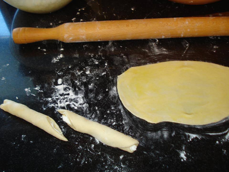 Το ρολαρουμε και το αφηνουμε στην ακρη σκεπασμενο!Ετσι κανουμε ολα τα φυλλα μας! Παιρνουμε τρια ρολα και πλεκουμε με προσοχη οπως τα τσουρεκια!