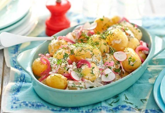 Σε μια κατσαρόλα με αλατόνερο, τοποθετήστε τις πατάτες και φέρτε τες σε βράση. Αφήστε τες να σιγοβράσουν για 12 λεπτά μέχρι να έχουν μαγειρευτεί τελείως. Στραγγίστε τες και αφήστε τες να κρυώσουν.