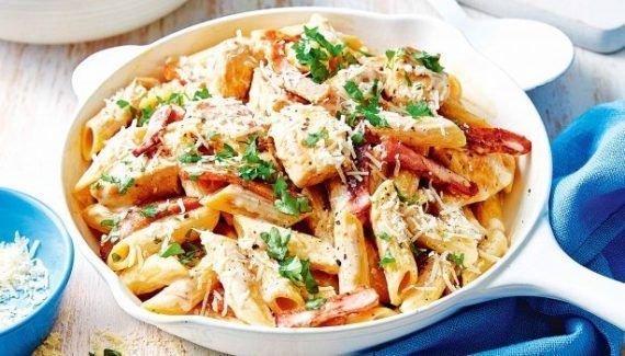 Μια εύκολη συνταγή για μια υπέροχη, κρεμώδη, καρμπονάρα με κοτόπουλο για το καθημερινό τραπέζι σας για όλη την οικογένεια, που σίγουρα θα απολαύσετε μικροί και μεγάλοι. Υλικά συνταγής 500 γρ. πένες 2 κ.σ. ελαιόλαδο 500 γρ. στήθος φιλέτου κοτόπουλου, κομμένο σε κομμάτια 2 εκ. 12 φέτες μπέικον κομμένες σε μικρές φέτες 2 σκελίδες σκόρδο, πολτοποιημένες 1 φλιτζάνι (250 ml) ζωμό κότας 2 κρόκους αυγών 3/4 φλιτζάνια (185 ml) κρέμα γάλακτος πλήρης 1 κ.σ. κορν φλάουρ 1/2 φλ. τσαγιού παρμεζάνα τριμμένη 2 κ.σ. μαϊντανό, ψιλοκομμένο αλάτι πιπέρι Εκτέλεση συνταγής