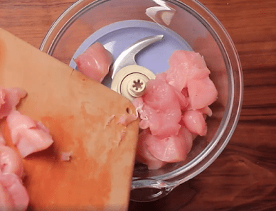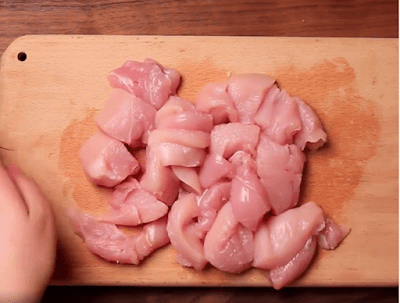 Τι κάνουμε Παίρνουμε ένα φιλέτο από κοτόπουλο και το κόβουμε πρώτα σε λωρίδες και μετά σε κομματάκια καρέ