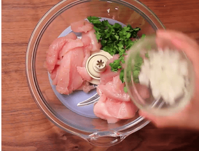 Στήθος κοτόπουλο 1 ματσάκι μαϊντανό 1 ψιλοτριμμένο ξερό κρεμμύδι Αλάτι πιπέρι Τυρί τριγωνάκι τύπου la vache