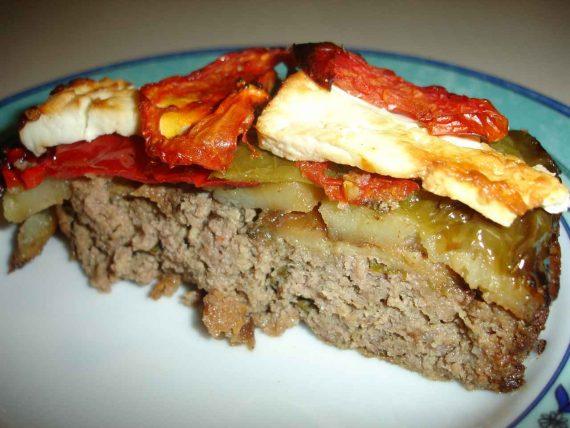 Υλικά (για 2 μακρόστενες φόρμες του κέικ) 1/2 κιλό κιμά 1 μεγάλο κρεμμύδι τριμμένο στον τρίφτη 1 αυγό 3 ώριμες ντομάτες 4 πράσινες πιπεριές 3 κόκκινες πιπεριές Φλωρίνης 2 μεγάλα κολοκυθάκια 2 μελιτζάνες 4 φέτες ψωμί μπαγιάτικες 1 φλιτζάνι μαϊντανό ψιλοκομμένο 1 κουταλιά της σούπας ξερό δυόσμο 2 μεγάλες πατάτες 4 φέτες τυρί Λίγη φρυγανιά Αλάτι-πιπέρι-μοσχοκάρυδο