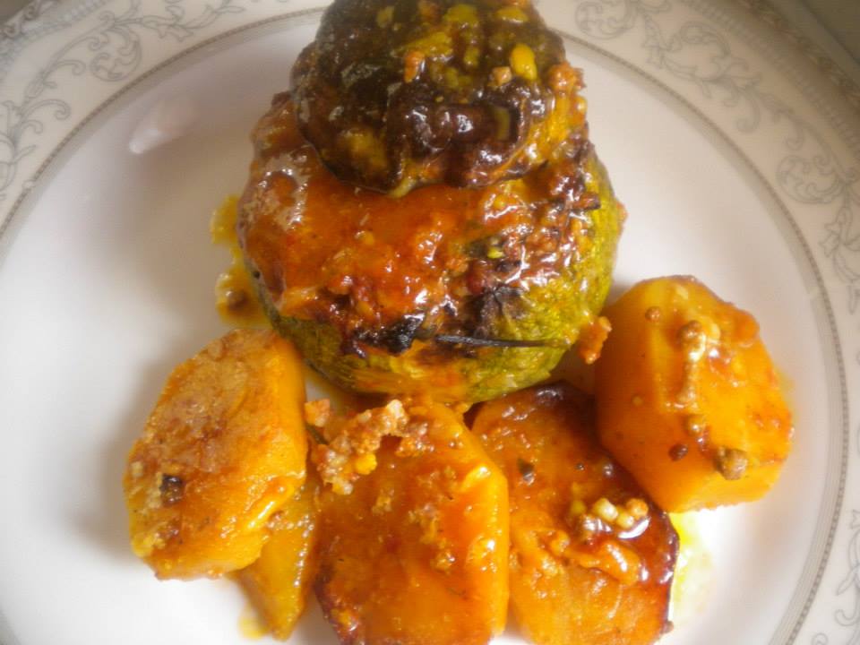Σε ένα πυρέξ μεταφέρουμε τα κολοκύθια μας τα τρυπάμε λίγο με ένα πιρούνι στο πλάι και τα γεμίζουμε. Γύρω -γύρω βάζουμε τις πατάτες. Σε ένα μπολ βάζουμε 1 ½ κούπα νερό, και διαλύουμε τον ζωμό. Προσθέτουμε τον κρόκο Κοζάνης και 2-3 κ . σ . εξαιρετικό ελαιόλαδο. Τα ανακατεύουμε και τα ρίχνουμε μέσα στο πυρέξ. Ο ζωμός πρέπει να φτάνει μέχρι το μέσο του ύψους του κολοκυθιού. Ψήνουμε στον αέρα για 1 ώρα περίπου στους 180 -200 βαθμούς. Μόλις ψηθεί αφαιρούμε το ζωμό από το πυρέξ, τον βάζουμε σε ένα τηγάνι και τον βράζουμε να μείνει ελάχιστος ( 7- 8 κ. σ ρίχνουμε και λίγο βούτυρο να δέσει η σάλτσα και σο τέλος προσθέτουμε τη γραβιέρα. Με τη σάλτσα αυτή περιχύνουμε τα κολοκύθια μας και τις πατάτες μας. Το βάζουμε στον σβηστό φούρνο για 5- 10 λεπτά και σερβίρουμε….