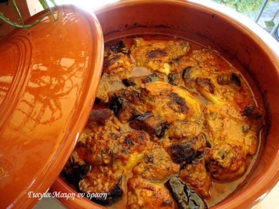Κοτόπουλο με μελιτζάνες by Mairh υλικά 6-8 κομμάτια κοτόπουλο 4 μελιτζάνες φλάσκες 150 γραμ φέτα 1 πιπεριά 1 μεγάλο κρεμμύδι 3 σκελίδες σκόρδο 1 ποτήρι ντοματοχυμό 1/2 νεροπότηρο ελαιόλαδο 1 1/2 ποτήρια νερό αλατι πιπέρι μια χούφτα ψιλοκομμένο μαϊντανό εκτέλεση από το βράδυ κόβουμε χοντρές ροδέλες τις μελιτζάνες και τις τηγανίζουμε να μείνουν όλη νύχτα σε ένα σουρωτήρι να στραγγίξουν!! την επόμενη μέρα κόβουμε το κοτόπουλο σε μερίδες το πλένουμε καλά το τηγανίζουμε ελαφρώς και το βάζουμε στην γάστρα μας!!!! σε μια λεκανίτσα βάζουμε την φέτα το κρεμμύδι το σκόρδο την ντομάτα και από εκεί μέσα παίρνουμε μικρές ποσότητες και τις πολτοποιούμε στο μουλτι προσθέτοντας και λίγο νεράκι κάθε φορά για να δουλεύονται εύκολα τα υλικά μας! στην συνέχεια βάζουμε όλο αυτό τον πολτό σε μια κανάτα και τον ανακατεύουμε να είναι όλα μαζί τα υλικά!!!! πιπερώνουμε το κοτοπουλάκι μας προσοχή στο αλάτι γιατί υπάρχει η φέτα καλό είναι να δοκιμάσετε αργότερα που θα το ψήνετε και αν θέλετε να βάλετε λιγάκι, και ρίχνουμε από πάνω όλο τον πολτό που εχουμε κάνει και προσθέτουμε και το λαδάκια μας σκεπάζουμε την γάστρα και το ψήνουμε στους 200 για μια ώρα! όταν είναι έτοιμο ανοίγουμε την γάστρα γυρίζουμε το κοτόπουλο και ριχνουμε τον μαϊντανό και τις μελιτζάνες και το βάζουμε ξανά στον φούρνο μας για ακόμα 20 λεπτακια!!! αυτή η γεύση δεν υπάρχει!!!