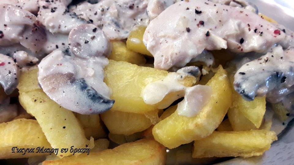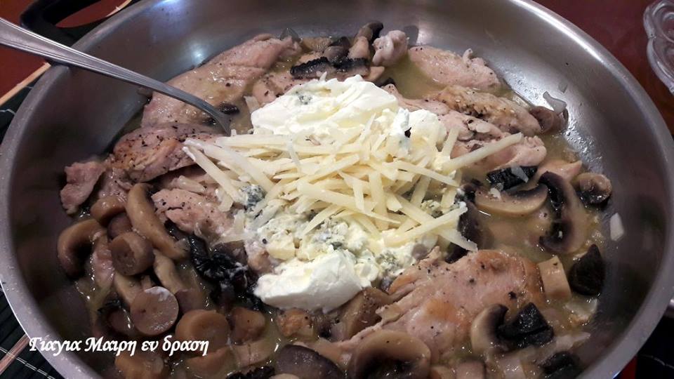 Υλικά 2 φιλετάκια κοτόπουλο κομμένα σε λεπτές φετούλες αυτό μπορεί να γίνει και με ψαρονέφρι 1 συσκευασία φρέσκα μανιτάρια κομμένα σε φετούλες 1 Φιλαδέλφεια 100 γραμ blue cheese 50 γραμ παρμεζάνα τριμμένο 4 κσ ελαιόλαδο 1 ποτήρι του νερού κρασί 1 μεγάλο κρεμμύδι χοντροκομμένο 1 σκελίδα σκόρδο ψιλοτριμμένη λίγο αλατι μπόλικο πιπέρι