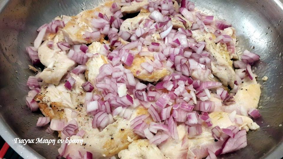 Πλένουμε στραγγίζουμε αλατοπιπερώνουμε τα φιλετάκια κοτόπουλο. Σε ένα βαθύ σκεύος βάζουμε το ελαιόλαδο και σοτάρουμε τα φιλετάκια. Προσθέτουμε το κρεμμύδι και το σκόρδο και συνεχίζουμε το σοτάρισμα για 3-4 λεπτακια.