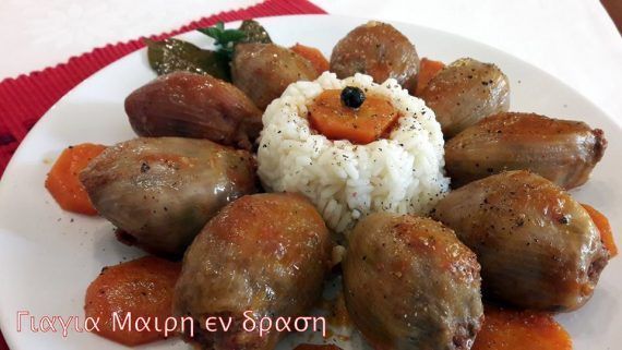 Κρεμμυδοντολμάδες γιαχνί Ένα πολύ νόστιμο κυριακάτικο φαγάκι Υλικά 12 Με 15 μεγάλα κρεμμύδια 500 γραμ κιμά μοσχαρίσιο 1 κούπα ρύζι γλασέ μια χούφτα ψιλοκομμένο μαϊντανό 1 καρότο τριμμένο στο ψιλό του τρίφτη 2 καρότα σε ροδέλες 1 πράσινη πιπεριά σε κυβάκια 1 κόκκινη πιπεριά σε κυβάκια 1 κολοκυθάκι χοντροτριμμένο 1 μικρή μελιτζάνα χοντροτριμμένη 2 σκελίδες σκόρδο τριμμένο αλάτι πιπέρι μπαχάρι σε κόκκους 2-3 φύλλα δάφνη 1 ξυλάκι κανέλα 1 σφηνάκι ξίδι 1 ποτήρι ντοματοπολτό ελαιόλαδο Εκτέλεση καθαρίζουμε και χαράζουμε τα κρεμμύδια μέχρι το κέντρο. Σε μια κατσαρόλα βάζουμε αλατισμένο νερό και μόλις πάρει βράσει ρίχνουμε τα κρεμμύδια για 5 λεπτά. Τα σουρώνουμε και τα βάζουμε σε μια λεκανίτσα με κρύο νερό και βγάζουμε ένα ένα τα φύλλα. Όταν φτάσουμε στο κέντρο που τα φύλλα είναι μικρά ψιλοκόβουμε το κρεμμύδι που μας έμεινε να το προσθέσουμε στην γέμιση. Σε μια λεκανίτσα βάζουμε τον κιμά το ρύζι τις πιπεριές τα τριμμένα κολοκυθάκι μελιτζάνα και καρότο το σκόρδο τον μαϊντανό, το αλατοπίπερο το ελαιόλαδο και ένα ποτηράκι του κρασιού νερό και τα ζυμώνουμε να γίνει μια ζύμη αφράτη. Παίρνουμε ένα ένα τα φύλλα και στην άκρη βάζουμε μια μεγάλη κουτάλια γέμιση. Τα κλείνουμε ρολάκια και τα τοποθετούμε σε μια κατσαρόλα κυκλικά το ένα διπλά στο άλλο. Όταν είναι όλα έτοιμα ρίχνουμε λίγο λαδάκι από πάνω μπόλικο αλατοπίπερο τις ροδέλες από τα καρότα την δάφνη το μπαχάρι την κανέλα το ξίδι και τον ντοματοχυμό. Τα σκεπάζουμε με ένα πιάτο και ρίχνουμε ένα ποτήρι βραστό νερό. Τα βράζουμε σε χαμηλή φωτιά μέχρι να μαλακώσουν και κουνάμε πολύ συχνά την κατσαρόλα μας κυκλικά αν η κουζίνα σας είναι μέχρι το 9 καλό είναι να τα βράζετε στο 5 για 2 ώρες περίπου. Το πιάτο το βγάζουμε μετά από το πρώτο τέταρτο για να μπορούμε να Παρακολουθούμε το φαγάκι μας αν θέλει κι άλλο νερό. Πολλές φορές τα κρεμμύδια δεν έχουν πολλά φύλλα και περισσεύει γέμιση. Εγώ στην γέμιση που περίσσεψε έριξα 2 ντομάτες τριμμένες δυόσμο ξερό και γέμισα με ότι είχα στο ψυγείο μου!!! Είναι ένα καλοκαιρινό φαγάκι όμως όταν το επιθυμείς πολύ το κάνεις και στο καταχείμωνο!!!! καλή σας επιτυχία!!!!