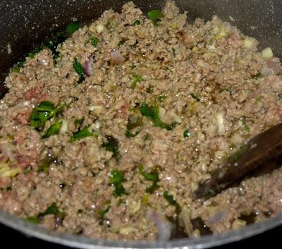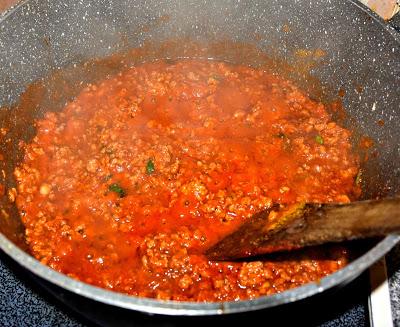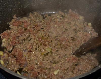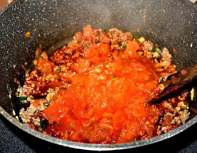 Βάζουμε στην κατσαρόλα το λάδι,ρίχνετε το κρεμμύδι τον σκόρδο και τον κιμά και τα σοτάρουμε μέχρι να καφετίσουν ανακατεύοντας συνεχώς με ξύλινη κουτάλα. Λιώνουμε σ ένα μπολ τις ντομάτες με τα χέρια πολύ καλά.