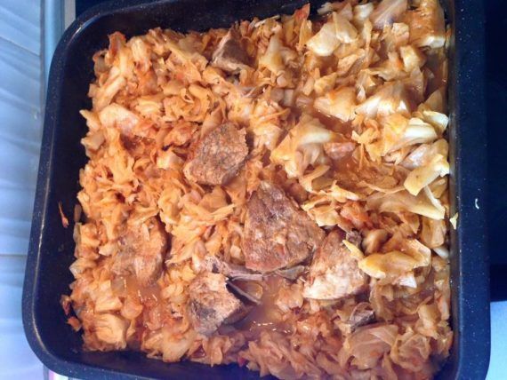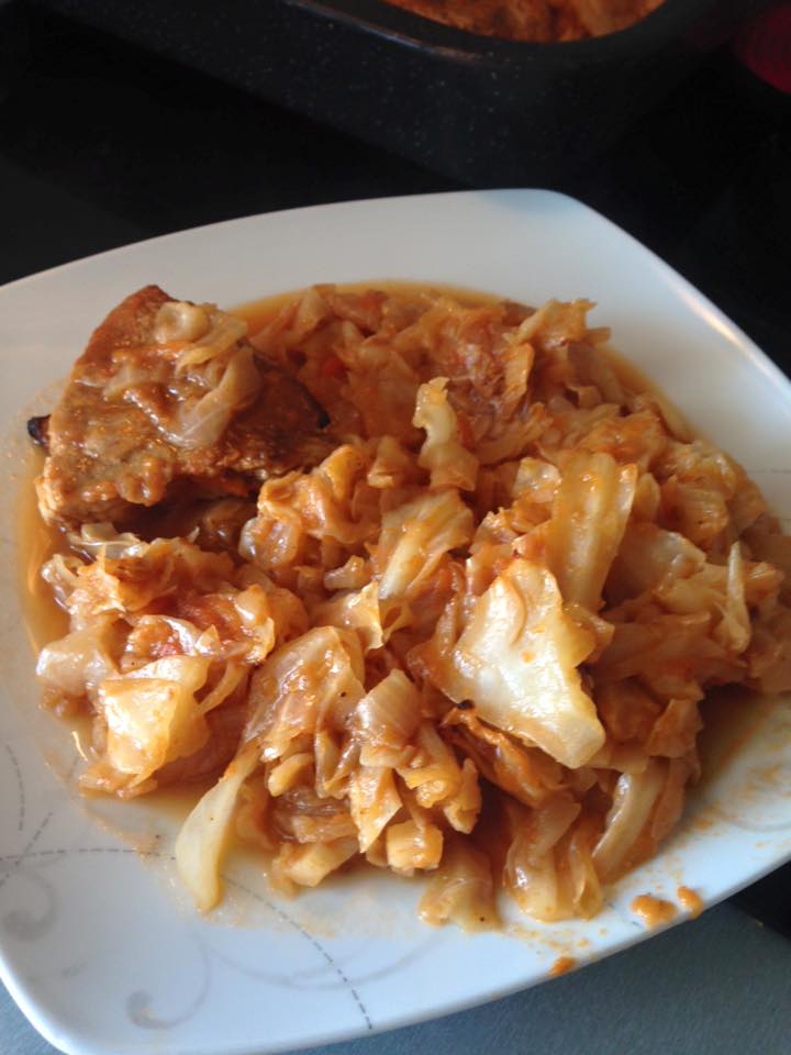 (Προαιρετικά και ελάχιστο ρυζάκι) Υλικά 1 λάχανο Χοιρινό ότι μέρος θέλετε 3 ντομάτες στον τρίφτη 1 μεγάλο κρεμμύδι 1σκελίδα σκόρδο 1/2 κούπα λευκό κρασί 1καρότο τριμμένο στον τρίφτη Λίγο ελαιόλαδο για την κατσαρόλα Λίγο Αλάτι Λίγο Πιπέρι 1κ.γλ.ζάχαρη 1/2 κ.γλ.Μοσχοκάρυδο 1/2κ.γλ.κανέλα 1 δαφνόφυλλο Λίγη πάπρικα γλυκιά Νερό ζεστό όσο χρειαστεί 1φλυτζάνι του καφέ ρύζι (προαιρετικά) Εκτέλεση Σε μία κατσαρόλα σοτάρουμε το κρέας στο ελαιόλαδο και όταν κοντεύει να γίνει ρίχνουμε το κρεμμύδι και το τριμμένο καρότο μέχρι να μαραθούν και να πάρουν χρώμα. Στη συνέχεια τσιγαρίζουμε λίγο και το σκορδάκι μας. Σβήνουμε με λευκό κρασί και στη συνέχεια ανακαυεύουμε. Μόλις, εξατμιστεί το αλκοόλ ρίχνουμε την σάλτσα ντομάτας, το λάχανο (που προηγουμένως το έχουμε ζεματίσει σε κατσαρόλα με ζεστό νερό και κόψει σε μικρά κομμάτια),τα μπαχαρικά μας και ένα ποτήρι του νερού ζεστό νερό. Τα αφήνουμε όλα μαζί να πάρουν μία βράση μέχρι να ενσωματωθούν όλα τα υλικά μας όπως στην φωτογραφία μας. Ρίχνουμε το φαγητό σε ένα ταψί,αφαιρούμε την δάφνη και το βάζουμε στον φούρνο για 40 λεπτά σκεπασμένο με αλουμινόχαρτο στους 200 βαθμούς πάνω κάτω. Ανοίγουμε το αλουμινόχαρτο και ξαναψήνουμε άλλα 50 περίπου λεπτά στους 160 μέχρι να πάρουν καλό χρώμα από πάνω και σωθούν τα πολλά υγρά του φαγητού μας. Μπορούμε φυσικά 15-20 λεπτά πριν γίνει το φαγητό μας να προσθέσουμε και ένα φλιτζανάκι του καφέ ρύζι. Σερβίρουμε με τριμμένη φέτα της επιλογής μας ή και σκέτο όπως εμείς! Καλή απόλαυση!