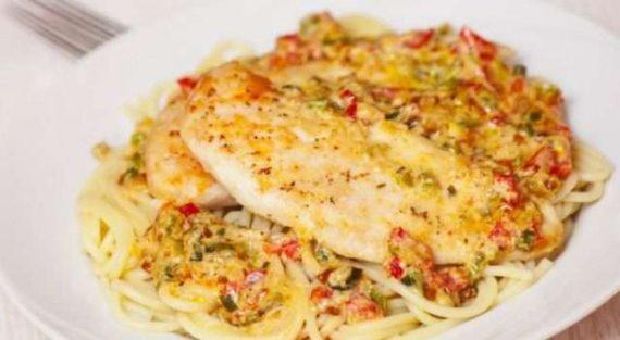 Προθερμαίνετε το φούρνο στους 180 βαθμούς. Κόβετε το κοτόπουλο οριζόντια στη μέση για να έχετε 4 λεπτά φιλέτα. Τα αλατοπιπερώνετε και από τις 2 πλευρές, τα τοποθετείτε σε λαδωμένο ταψί και τα ψήνετε στο προθερμασμένο φούρνο για 25 λ περίπου ή μέχρι να ψηθούν μέχρι μέσα. Μη τα παραψήσετε γιατί θα στεγνώσουν και θα χάσουν τους ζωμούς τους. Εν τω μεταξύ, βράζετε το ζυμαρικό σας σε μπόλικο, κοχλαστό αλατισμένο νερό, αλ τέντε, σύμφωνα με τις οδηγίες της συσκευασίας. Το στραγγίζετε καλά, το λαδώνετε με λίγο ελαιόλαδο, ανακατεύετε και το διατηρείτε ζεστό.