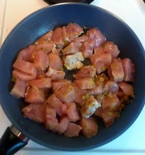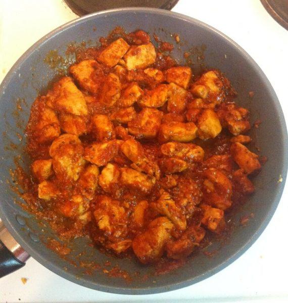 Κόβουμε το κοτόπουλο σε μεγάλα κομμάτια, τα ξεπλένουμε και τα αλατοπιπερώνουμε. Έπειτα τα αλείφουμε με το σκόρδο. Σε ένα αντικολλητικό τηγάνι σωτάρουμε το κρεμμύδι. Στη συνέχεια προσθέτουμε το κοτόπουλο και το σωτάρουμε μέχρι να πάρει χρώμα από όλες τις πλευρές.