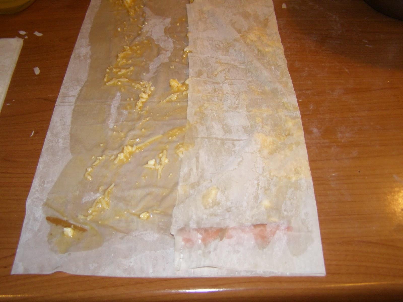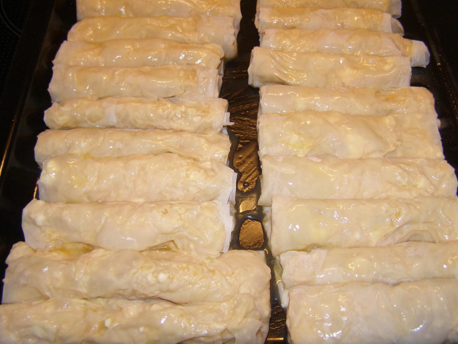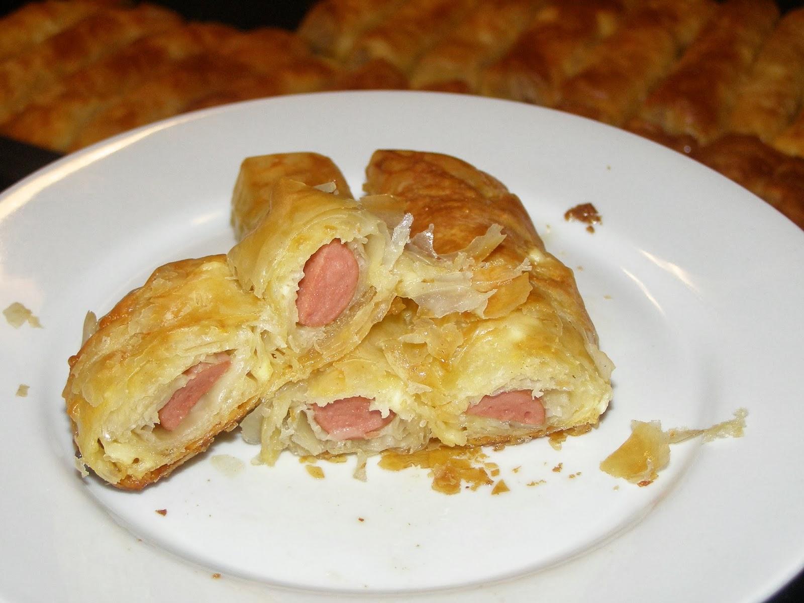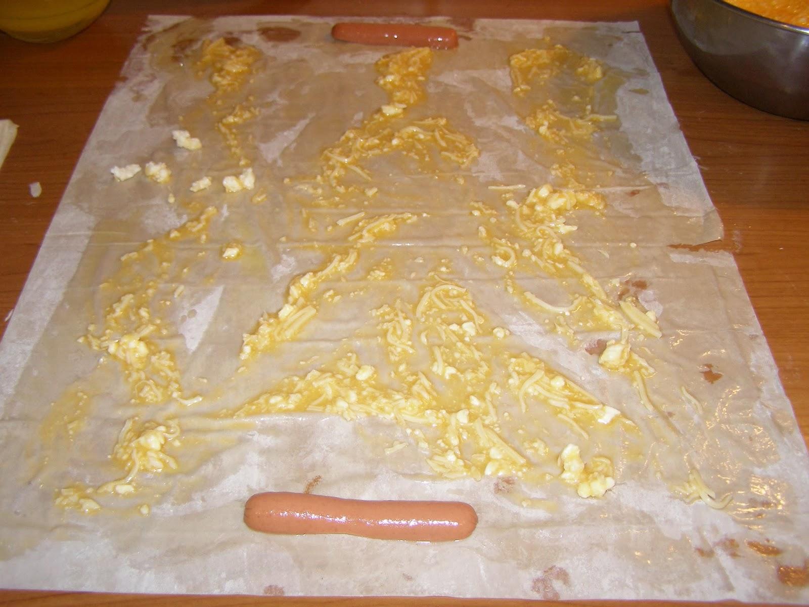 500γρ φύλλο κρούστας 250γρ τυριά τριμμένα 10-12 λουκάνικα (όσα είναι και τα φύλλα) 5 αυγά βούτυρο λιωμένο
