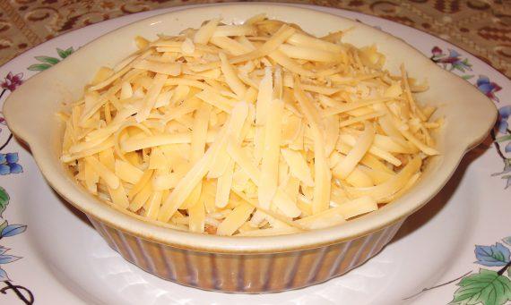 Τέλος βάζουμε και το τριμμένο τυρί από πάνω και βάζουμε σε προθερμασμένο φούρνο γύρω στους 180 βαθμούς και ψήνουμε μέχρι να λιώσει και να ροδίσει λίγο το τυρί μας!