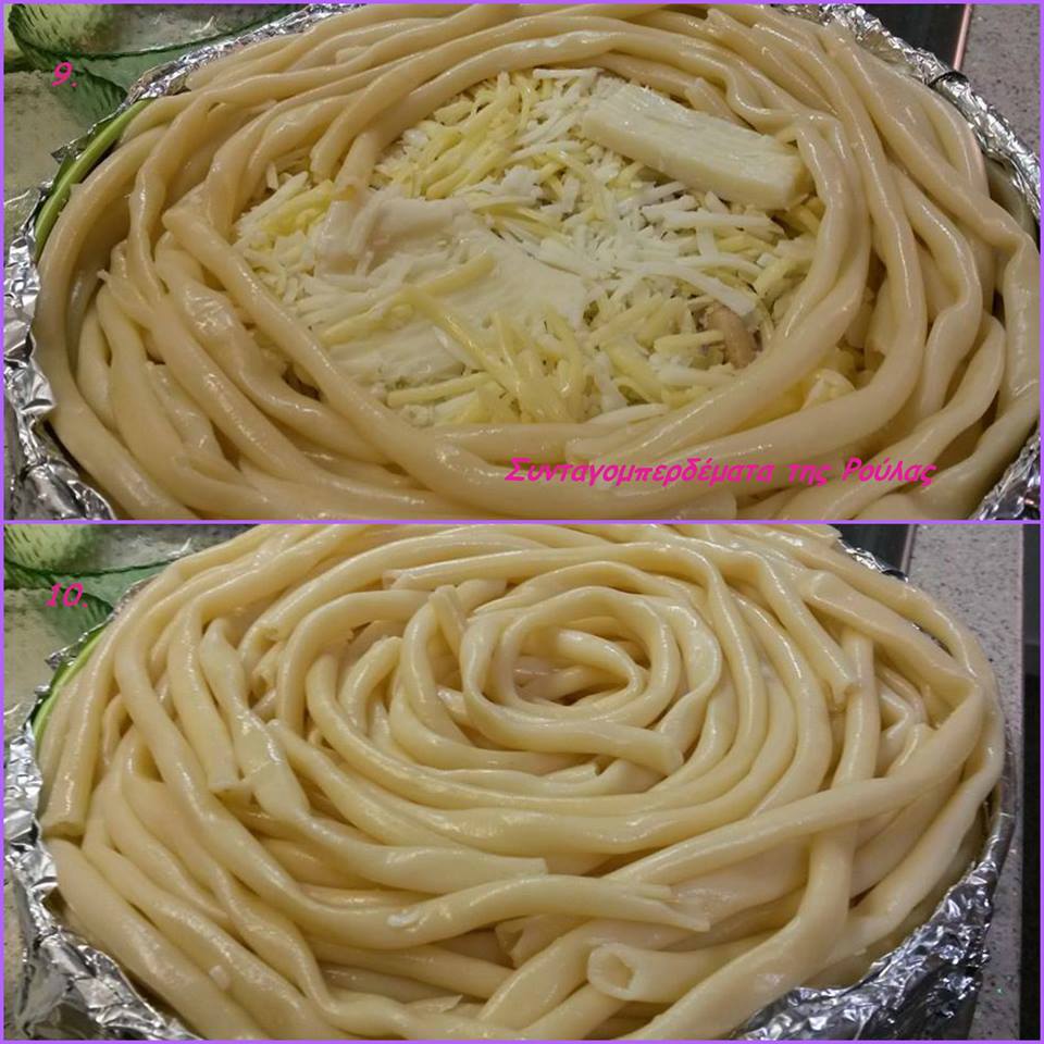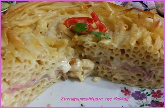 ‘’ΜΑΚΑΡΟΝΟΤΟΥΡΤΑ’’ !!! Πως με ένα διαφορετικό στήσιμο μπορούμε να μετατρέψουμε ένα καθημερινό φαγητό κατάλληλο για επίσημο δείπνο ! Υλικά : – 1 πακέτο (500γραμ.) μακαρόνια Νο2 για παστίτσιο – 150 γραμ. τυρί Γκούντα τριμμένο – 150 γραμ. γραβιέρα τριμμένη – 6 φέτες ζαμπόν (ζητήστε να σας τις κόψουν λίγο πιο χοντρές) – 1 μικρή κονσέρβα μανιτάρια σε φέτες (120 γραμ) – 1 μικρό ξερό κρεμμύδι (προαιρετικά) – 80 γραμ. τυρί κρέμα – 4 αυγά – 250 γραμ. γάλα πλήρες – αλάτι, πιπέρι – λίγο βούτυρο, λίγη τριμμένη φρυγανιά Εκτέλεση : – Σε αλατισμένο νερό που βράζει ρίχνουμε τα μακαρόνια ολόκληρα (χωρίς να τα σπάσουμε) και βράζουμε σύμφωνα με τις οδηγίες. – Σουρώνουμε και αφήνουμε να στραγγίξουν καλά. – Κόβουμε το ζαμπόν και το κρεμμύδι σε κύβους. – Παίρνουμε μια αποσπώμενη φόρμα διαμέτρου 26 εκατ. , τη βουτυρώνουμε, πασπαλίζουμε με τη φρυγανιά και στη συνέχεια την ντύνουμε με αλουμινόχαρτο όπως φαίνεται στην εικόνα Νο.3 (αυτό το κάνουμε για να μην ξεχειλίσει το μείγμα με τα αυγά που θα προσθέσουμε παρακάτω). – Παίρνουμε τώρα λίγα από τα μακαρόνια και τα στρώνουμε κυκλικά μέχρι να καλυφθεί όλος ο πάτος (εικόνα Νο.4) και συνεχίζουμε μέχρι να φτάσουμε περίπου στη μέση της φόρμας. – Βάζουμε μια στρώση ζαμπόν, μία κρεμμύδι (αν δεν μας αρέσει το παραλείπουμε), μια μανιτάρια και μία τυριά (κρατάμε λίγο τυράκι στην άκρη για την επιφάνεια) και αφήνουμε 1 εκατοστό περιμετρικά χωρίς γέμιση. – Τοποθετούμε από πάνω, με τον ίδιο κυκλικό τρόπο, τα υπόλοιπα μακαρόνια και πασπαλίζουμε με το υπόλοιπο τυρί. – Σε μια λεκάνη ανακατεύουμε με το μίξερ το γάλα με τα αυγά, το τυρί κρέμα, το αλάτι και το πιπέρι και περιχύνουμε με το μείγμα την ‘’τούρτα’’ μας. – Ψήνουμε σε προθερμασμένο φούρνο, αερόθερμο, στους 175 βαθμούς για 35 λεπτά περίπου. – Αν χρειαστεί καλύπτουμε με αλουμινόχαρτο να μην ‘’αρπάξει’’ η επιφάνεια.