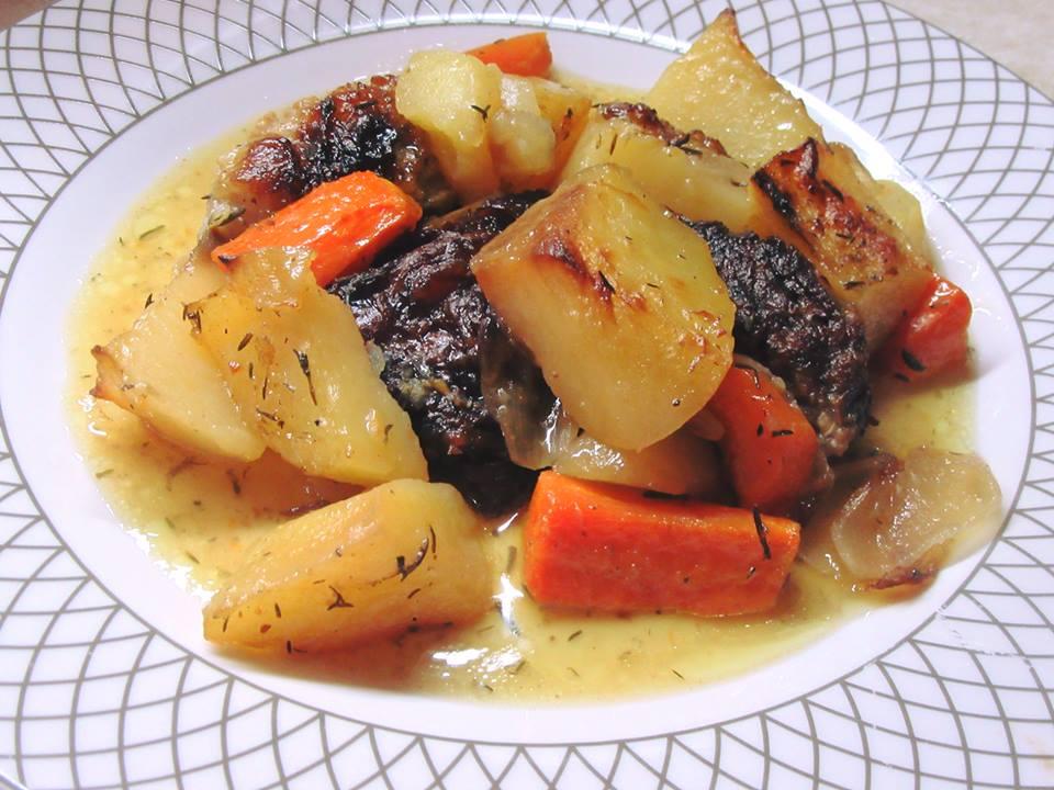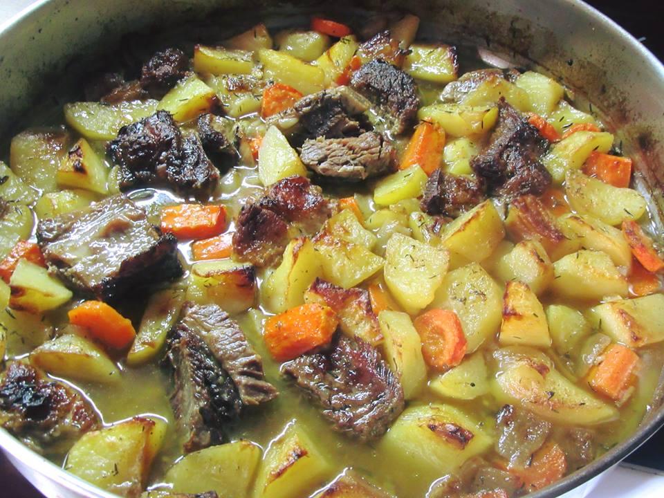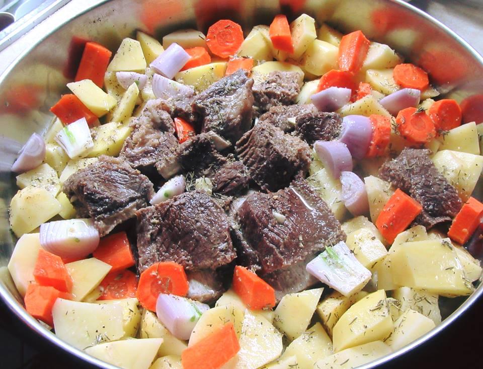 Έβρασα πρώτα το κρέας λίγο στην κατσαρόλα σε ταψί έκοψα τις πατάτες τα καρότα κ τα κρεμμύδια σε κομμάτια Έβαλα κ το κρέας και τα ανακάτεψα όλα μαζί με το σκόρδο λεμόνι μπαχαρικά κ το λάδι …τέλος έριχνα τον ζωμό από το κρέας αντί για νερό κ έψησα στους 180 μέχρι να γίνει το φαγητό..περίπου 2 ώρες κ κάτι.
