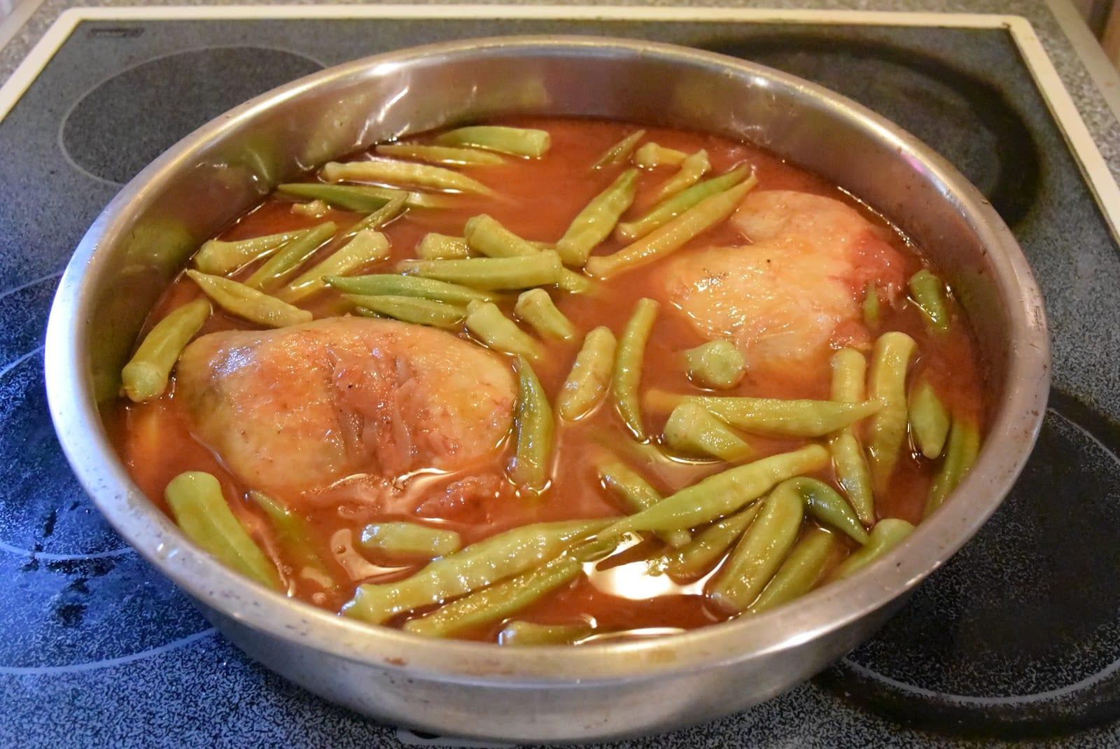 Αδειάζουμε το κοτόπουλο με την σάλτσα του στο ταψάκι που θα ψήσουμε . Σε τηγάνι βάζουμε λίγο λάδι και σε 2 δόσεις σοτάρουμε προσεκτικά τις μπάμιες μην ανοίξουν μέχρι να δούμε να αλλάξουν χρώμα περίπου 5 με 7 λεπτά .