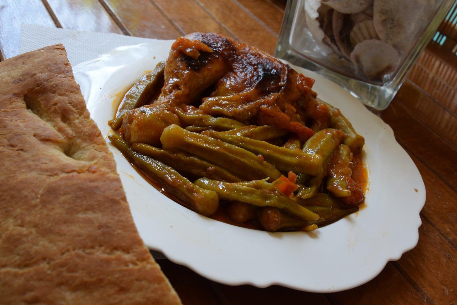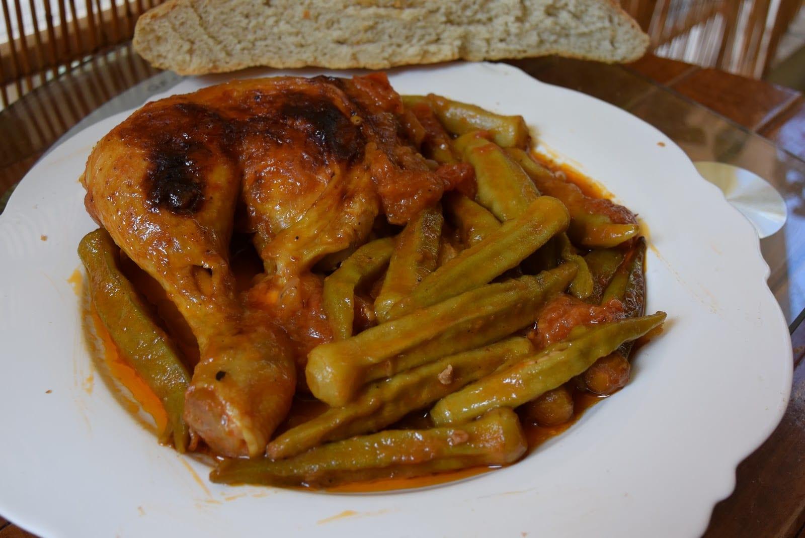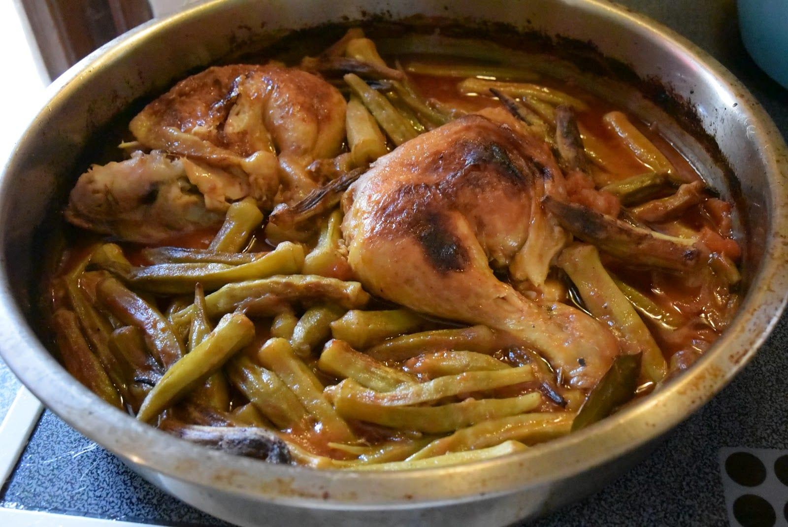 Εγώ είχα 2 μπουτάκια κι έβαλα μπορείτε να το φτιάξετε και με μισό κοτόπουλο και με ολόκληρο σε κομμάτια. 1 μεγάλο κρεμμύδι ξερό ή 2 μέτρια 2 σκελίδες σκόρδο 3 ώριμες ντομάτες λιωμένες με τα χέρια 1 κουταλιά σούπας πελτέ ντομάτας ελαιόλαδο αλάτι πιπέρι λίγη ζάχαρη και λίγο κουρκουμά 1 φύλλο δάφνης 1 πακέτο του κιλού μπάμιες κατεψυγμένες . Μηλόξιδο ή ξίδι απλό