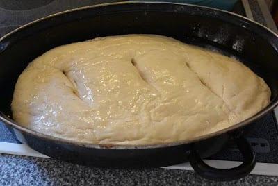 Παίρνω ένα ταψάκι το λαδώνω ελαφρώς το πασπαλίζω με αλεύρι το τινάζω και βάζω μέσα στρογγυλό το ζυμαράκι μου . Το απλώνω με το χέρι σε οτι σχήμα το σκεπάζω και το αφήνω λίγο να φουσκώσει. Σήμερα όταν έψηνα το φαγητό το ακούμπησα για θερμότητα πάνω στην κουζίνα. Μόλις φουσκώσει λίγο το χαράσσω 3 χαρακιές λοξά το χαϊδεύω με λαδωμένο χέρι και το ψήνω στους 180 περίπου ούτε 30 λεπτά ανάλογα τον φούρνο. Υπ όψιν δεν γίνεται το ψωμί με την πολύ ψίχα αλλά είναι κανονικό και πεντανόστιμο !