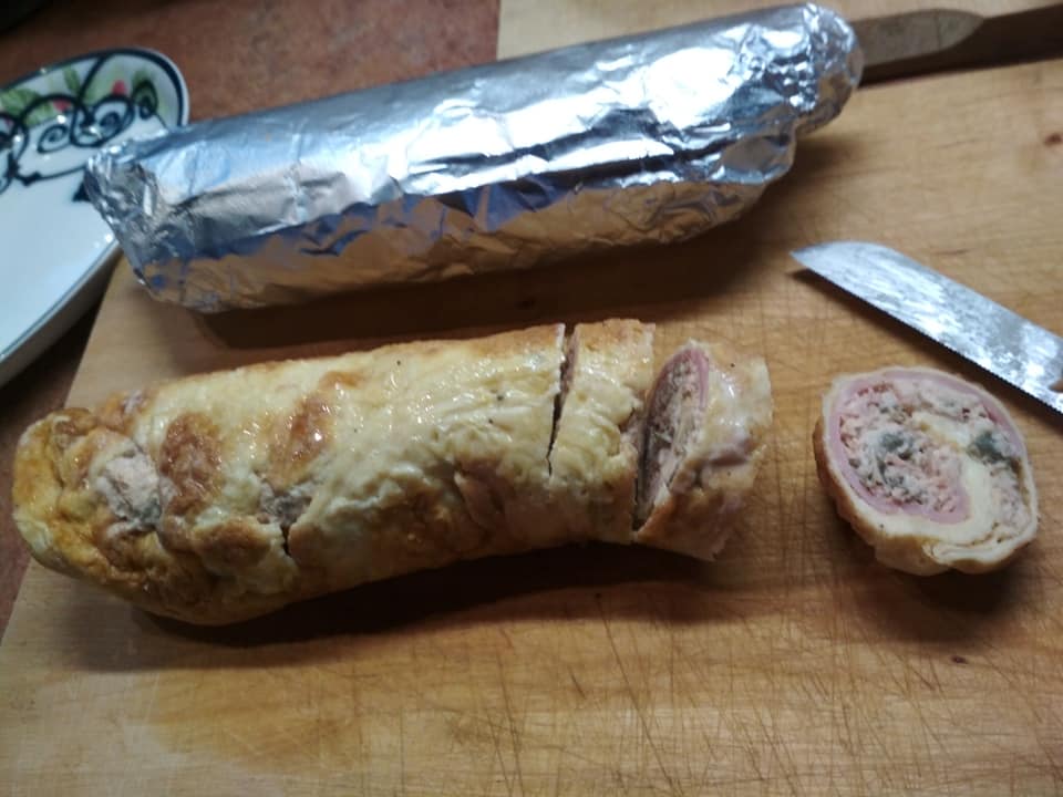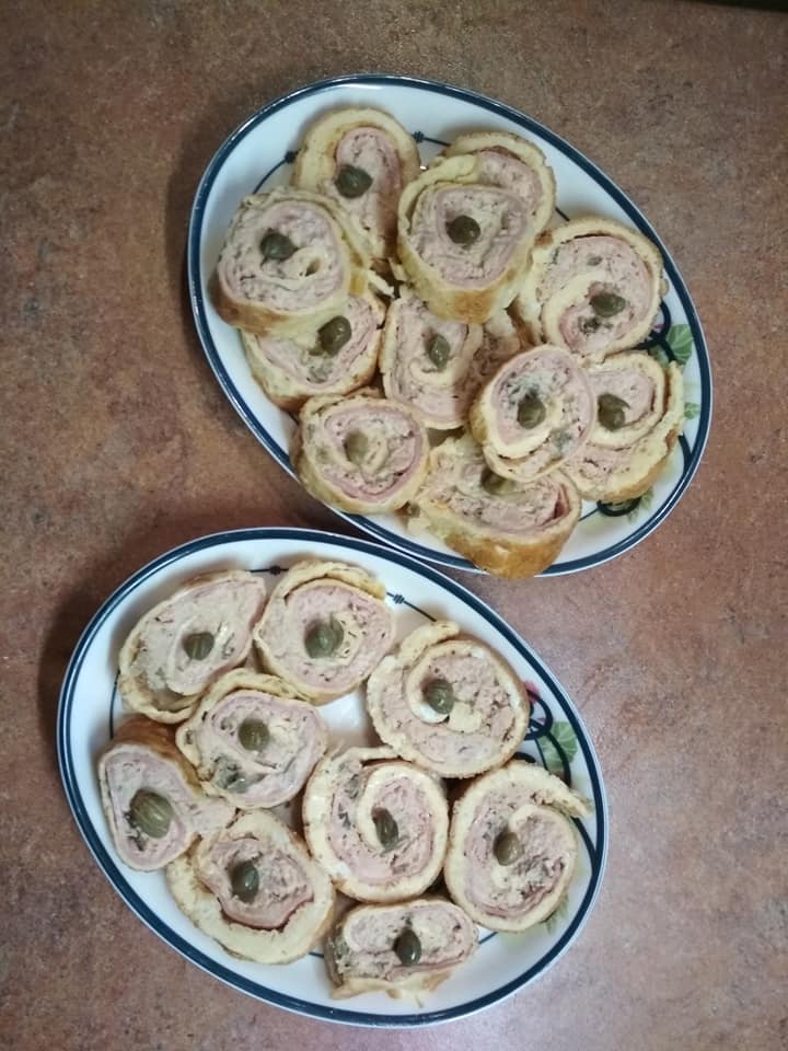 Χτυπάτε τα αυγά και ανακατεύετε πρώτα καλά το αλεύρι (καλύτερα περάστε το από σουρωτηρι. Αν σβωλιασει λίγο δεν πειράζει). Προσθέτετε τα υπόλοιπα υλικά. Τηγανιζετε με λίγο ελαιόλαδο ή βούτυρο σε μεσαίο τηγάνι το μισό μείγμα. Τοποθετείτε την ομελέτα πάνω σε αλουμινοχαρτο. Φτιάχνετε και την 2η ομελέτα. Πάνω στην κάθε ομελέτα απλώνετε 1,5 φέτα ζαμπόν και το μείγμα της γεμισης. Μην απλωσετε μέχρι πάνω γιατί στο τυλιγμα θα χυθεί έξω. Τυλιγετε τα ρολά (όχι πολύ σφιχτά) και τα κλείνετε καλά με το αλουμινοχαρτο. Βάζετε στο ψυγείο για μερικές ώρες να σφιξουν ή στην κατάψυξη για 30′. Κόβετε τα ρολά σε φετουλες. Βάζετε μια καπαρη αν θέλετε για στολισμα. (εάν τα θέλετε πιο πικαντικα, προσθέστε στη γεμιση λίγο πιπέρι καγιεν).