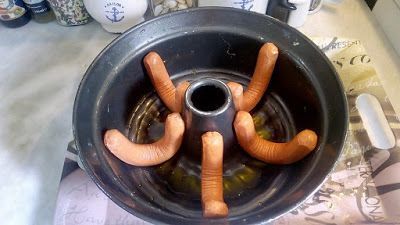 βάζουμε προσεκτικά τα λουκάνικα λυγίζοντας ελαφρά (δείτε τη φωτογραφία μου έχει πλάκα Γιατί γλιστράνε μερικές φορές)