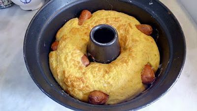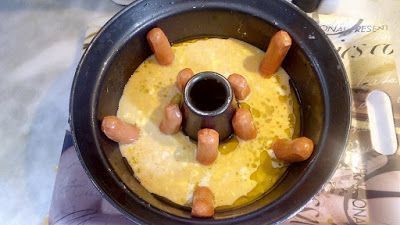 Χτυπάμε τα αυγά προσθέτουμε το αλεύρι να γίνει ένας λείος χυλός, διαλύουμε το baking στο νερό και προσθέτουμε στο μείγμα και ανακατεύοντας ελαφρά, προσθέτουμε την φέτα, αλάτι, πιπέρι. με κουτάλα βάζουμε προσεκτικά στη φόρμα το μείγμα για να μην κουνηθούν και πέσουν τα λουκάνικα.