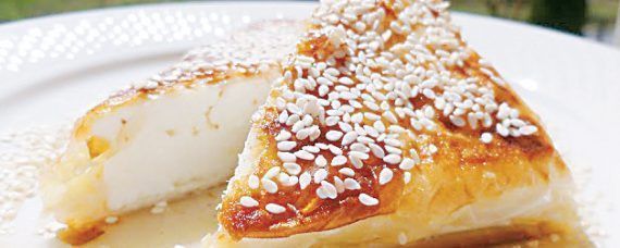 8 κομμάτια φέτα, περίπου 5 Χ 5 Χ 1εκ., 8 φύλλα ζύμης κρούστας (για μπακλαβά), 4 κουταλιές σησάμι (βρασμένο καλύτερα και στραγγισμένο), 8 κουταλιές (κοφτές) μέλι, 2 κουταλιές ξίδι, 2 κουταλιές νερό, ελαιόλαδο για τηγάνισμα και άλειμμα.