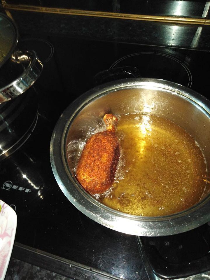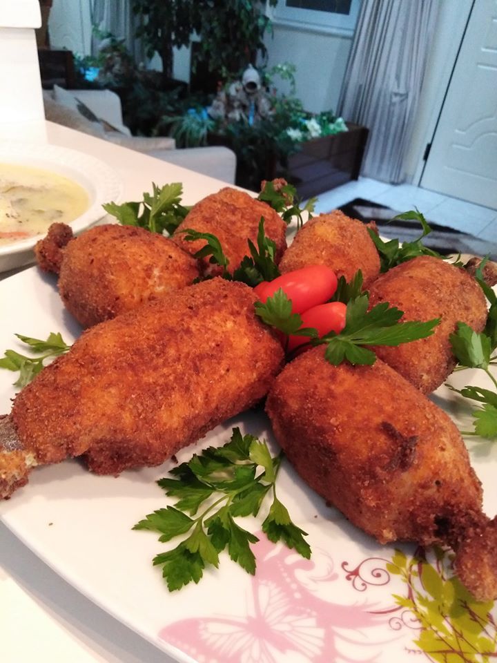 Έβρασα τα μπουτάκια κοτόπουλο με τις πατάτες και τα καρότα το ζουμί του έκανα σούπα αυγολέμονο το κρέας το χώρισα από τα κόκαλα και το έκοψα κομματάκια. Έλιωσα και τις πατάτες και δύο από τα καρότα. Έριξα αλάτι, πιπέρι, λίγο μοσχοκάρυδο, μία κούπα γκούντα, μία κούπα γραβιέρα τα έκανα ζύμη και τα χώρισα σε έξι μέρη. Έβαλα ενδιάμεσα το κόκκαλο τα πέρασα από αλεύρι αυγό και φρυγανιά και τα τηγάνισα σε μπόλικο ηλιέλαιο.