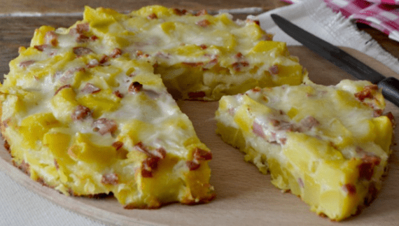 Πλένετε καλά τις πατάτες και τις βράζετε με τη φλούδα τους μέχρι να μαλακώσουν καλά. Τις στραγγίζετε και μόλις μισοκρυώσουν αφαιρείτε τη φλούδα τους και τις κόβετε σε μικρούς κύβους. Τοποθετείτε σε μπολ τους κύβους πατάτας, προσθέτετε τα αυγά χτυπημένα, τους κύβους ζαμπόν, τη τριμμένη φρυγανιά και τα 3/4 κύβους μοτσαρέλας, αλατοπιπερώνετε και ανακατεύετε καλά. Μεταφέρετε το μείγμα σε ένα λαδωμένο στρογγυλό ταψάκι (ή τηγάνι που να μπαίνει στο φούρνο) με διάμετρο βάσης 18 εκ. Σκεπάζετε το ταψάκι με λαδόκολλα και το ψήνετε σε προθερμασμένο στου 180 βαθμούς φούρνο για 15-20 λ. Στη συνέχεια, αφαιρείτε τη λαδόκολλα ρίχνετε από πάνω τα υπόλοιπα 1/4 κυβάκια μοτσαρέλας που έχετε κρατήσει, και συνεχίζετε το ψήσιμο για άλλα 5 λ μέχρι να λιώσει καλά η μοτσαρέλα. Το αφαιρείτε από το φούρνο το κόβετε σε κομμάτια και σερβίρετε.