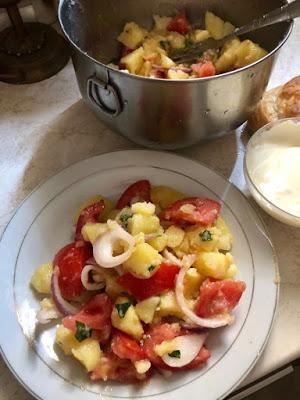 κατά βούληση η ποσότητες Βρασμένες πατάτες οχι λιώμα ντομάτες κρεμμύδι ξερό κομμένο σε κρίκους μαϊντανό ψιλοκομμένο ψιλοκομμένο παξιμαδάκι σε κομματάκια Αν θέλουμε βράζουμε και δυό αυγά σε φέτες κομμένα.