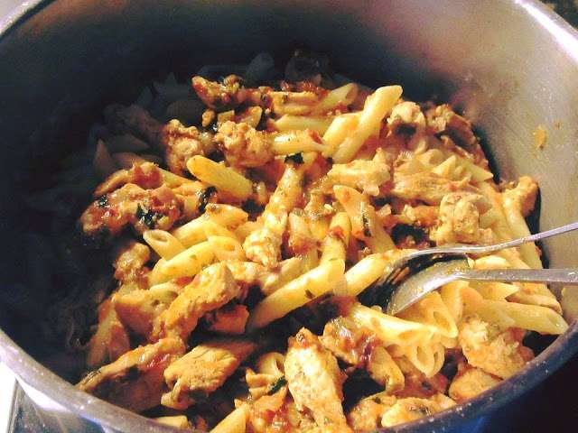 Εχω ετοιμασει και βουτυρωσει τις πενες, ριχνω το κοτοπουλο μεσα,ανακατευω και σερβιρω..!!