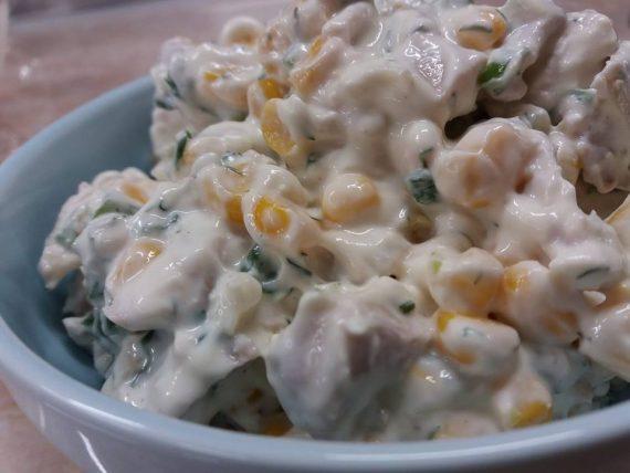 2 κούπες κοτόπουλο ψαχνό (στήθος ή μπούτι) βραστό ή ψητό ψιλοκομμένο 1 κούπα καλαμπόκι βρασμένο ¼ κούπας φρέσκο κρεμμυδάκι ψιλοκομμένο 2 συσκευασίες γιαούρτι στραγγιστό (400 γραμμάρια) 2 κουταλιές της σούπας μουστάρδα 2 κουταλιές της σούπας ελαιόλαδο 2 κουταλιές της σούπας χυμό λεμονιού 1 κουταλιά της σούπας άνηθο ψιλοκομμένο ¼ κουταλάκι του γλυκού αλάτι