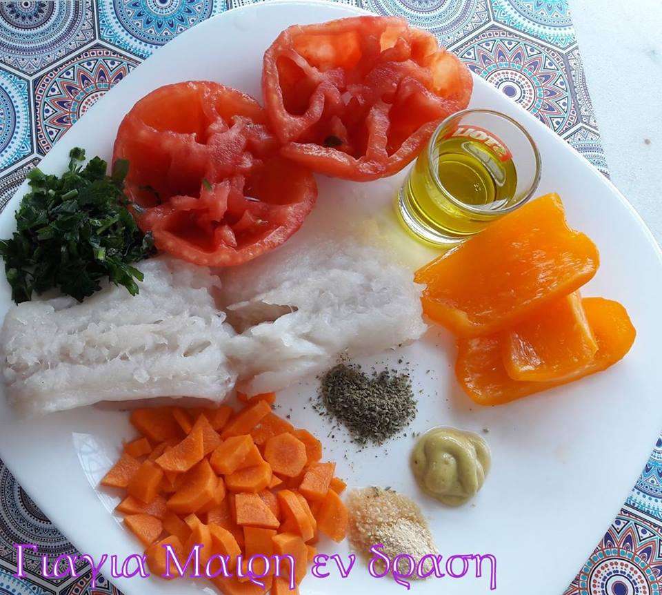 2 φιλέτα μπακαλιάρου φιλέτο 1 ντομάτα χωρίς φλούδα και σποράκια 1 καρότο σε μικρά κυβάκια 1 μεγάλη πατάτα σε μεγάλους κύβους 1 κσ μαϊντανό 1 κγ σκόρδο σκόνη 1 κγ μουστάρδα λιγη ρίγανη λίγο αλάτι λίγο πιπέρι 1/2 σφηνάκι ελαιόλαδο 1/2 πιπεριά πολύχρωμη