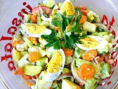 Για τη πατατοσαλάτα βράζω τις πατάτες με καρότα σε αλατισμένο νερό. Βράζω τα αυγά όσα θέλουμε και όταν κρυώσουν τα κόβουμε και συμπληρώνουμε, αγγούρι, ντομάτα, κρεμμύδι, πίκλες, κάπαρη, ελαιόλαδο, ξύδι, αλάτι πιπέρι, και ανακατεύουμε!!!! Καλή μας όρεξη!!