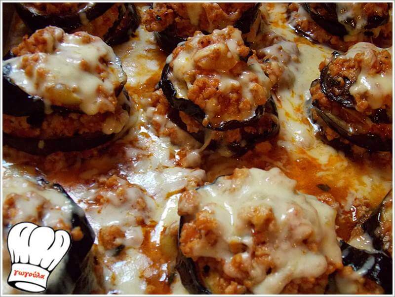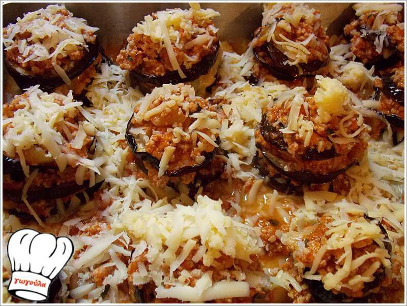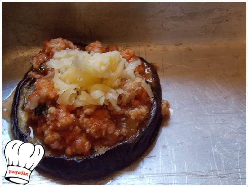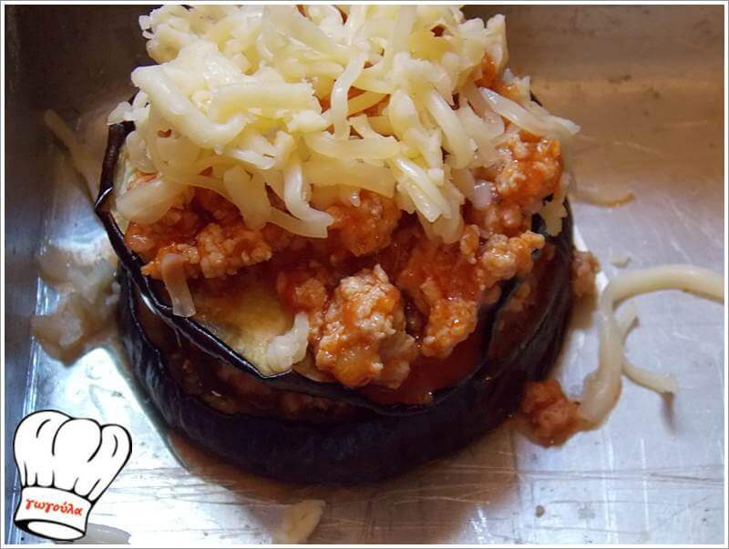 Σκεπαζουμε με αλλη ροδελα μελιτζανας,παλι κιμα παλι τριμμενο τυρι.