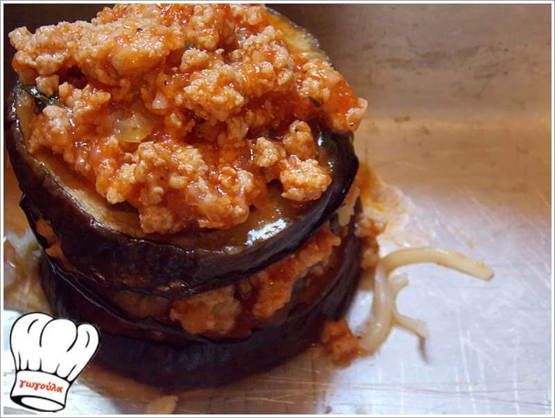 Σκεπαζουμε με μελιτζανα και κιμα χωρις να ριξουμε τυρι.