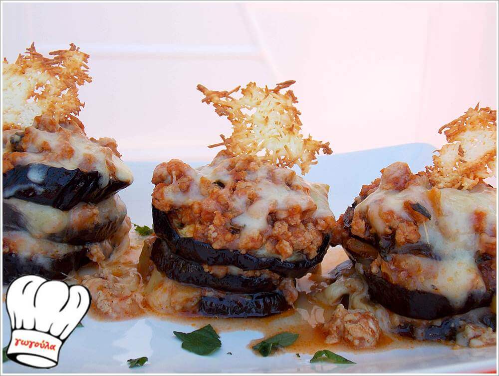Ενα αρκετα ελαφρα μαγειρεμενο φαγητο μα τοσο πεντανοστιμο και μυρωδατο. Πυργακια μελιτζανας με στρωσεις κιμα κοτοπουλου και τυρι λιωμενο γκουντα. Απολαυστε το!!!
