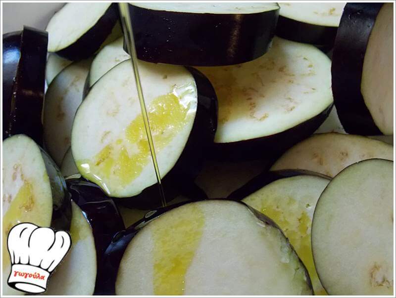 Αφου εχουμε καθαρισει και πλυνει τις μελιτζανες τις κοβουμε σε χονδρες ροδελες μεσα σε λεκανη. Προσθετουμε λιγο ελαιολαδο και λιγο αλατι και με τα χερια μας τις ανακατευουμε πολυ καλα.