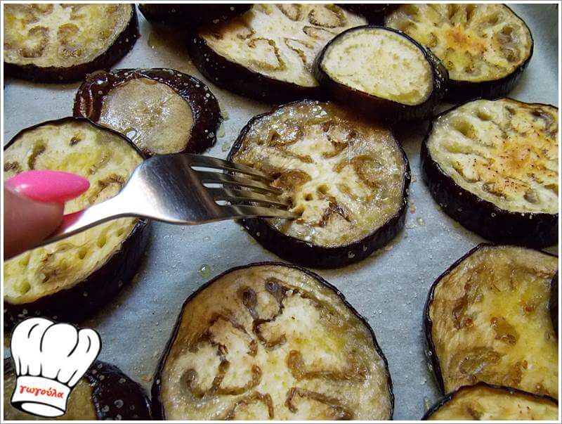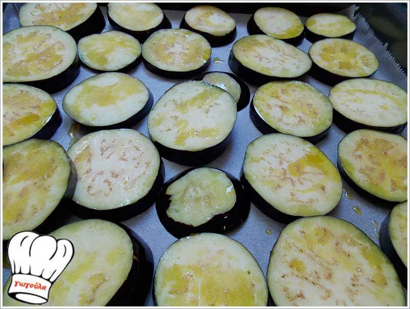 Σε λαμαρινα του φουρνου μας στρωνουμε αντικολλητικη λαδοκολλα και αραδιαζουμε τις μελιτζανες.