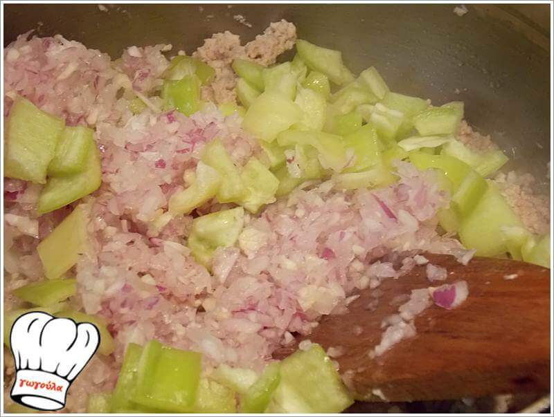 Κατοπιν προσθετουμε τα κρεμμυδια με το σκορδο την πιπερια και τα σωταρουμε ολα μαζι για 1-2 λεπτα σε μετρια θερμοκρασια.