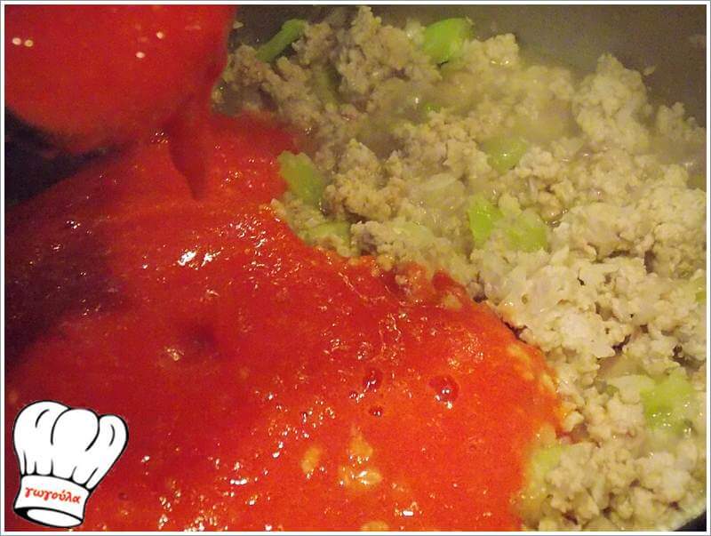Κατοπιν προσθετουμε τις τριμμενες ντοματες,