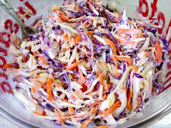 Για τη σαλάτα έτριψα το άσπρο και κόκκινο λάχανο, το καρότο έριξα λίγο αλάτι ελάχιστο ελαιόλαδο μία κουταλιά ξύδι και δυο-τρεις κουταλιές μαγιονέζα light.